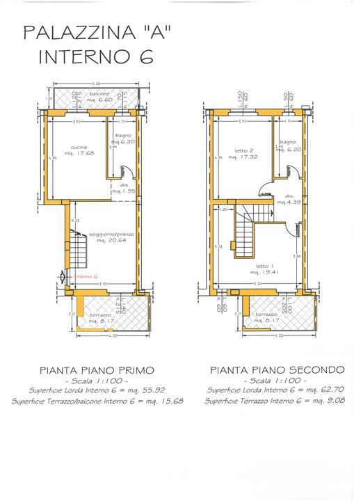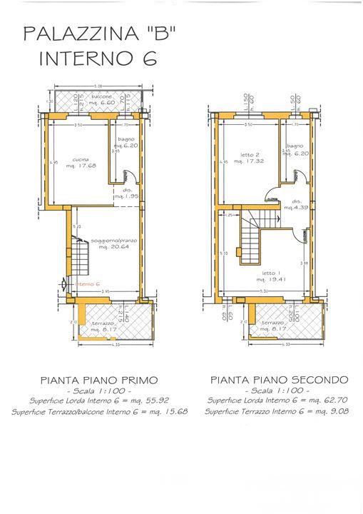 La soluzione duplex prevede una unità abitativa disposta su due livelli comprendenti: piano primo con ingresso in soggiorno-pranzo, disimpegno di collegamento a cucina e primo servizio igienico, terrazzo e balcone coperti per uscita sia dal soggiorno (frontale) che dalla zona cucina (sul retro), scala interna per raggiungimento del piano superiore formato da due ampie camere da letto (di cui una con terrazzo coperto) e secondo servizio igienico.