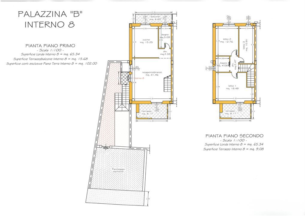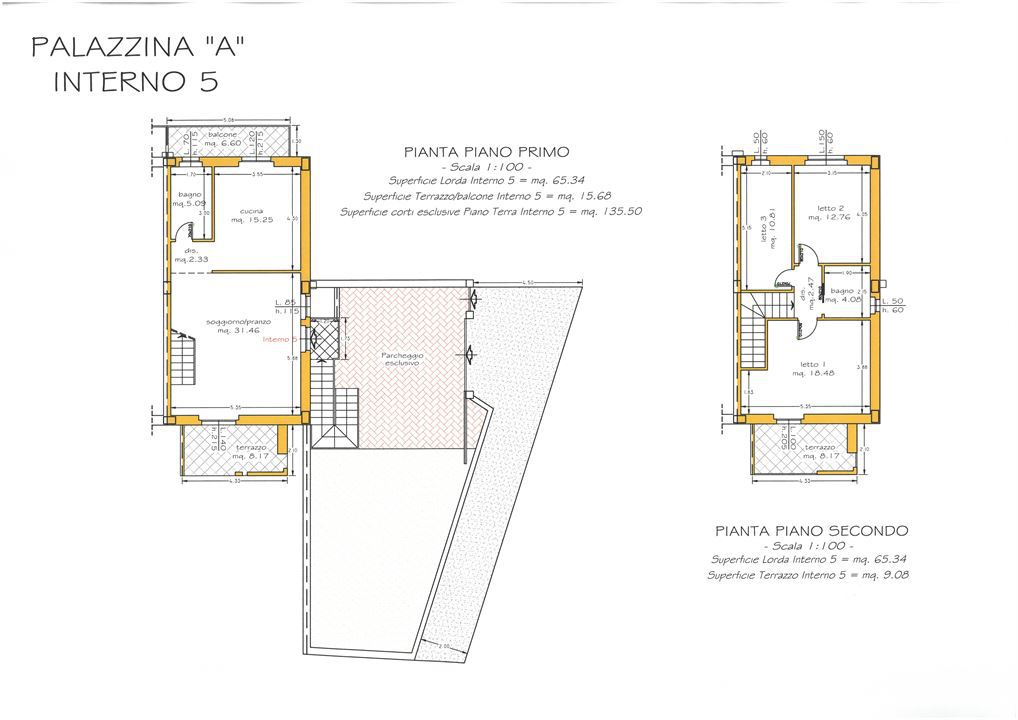 Disponibilità di duplex completo di giardino esclusivo posto al piano terra che consente di avere una totale indipendenza; di fatti le unità di testa disporranno di area carrabile per parcheggi di esclusiva proprietà, collegati all'ampio giardino privato dal quale raggiungere l'appartamento mediante scala esterna; Piano Primo composto da soggiorno-pranzo, cucina indipendente e primo bagno, scala interna per raggiungere il Piano Secondo con tre camere da letto (di cui una padronale con terrazzo coperto) e secondo bagno.