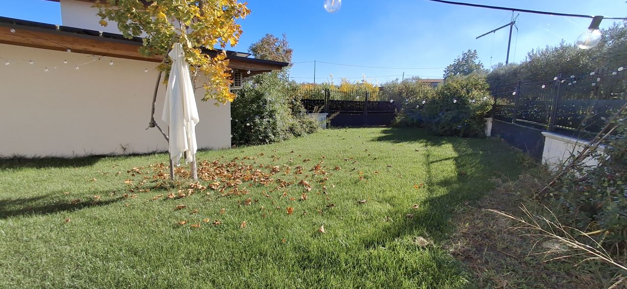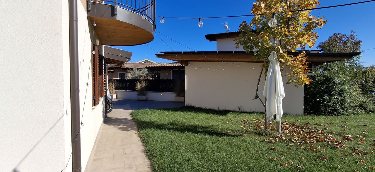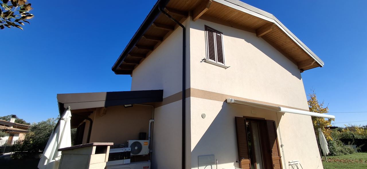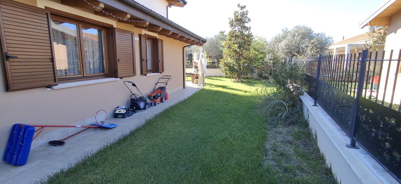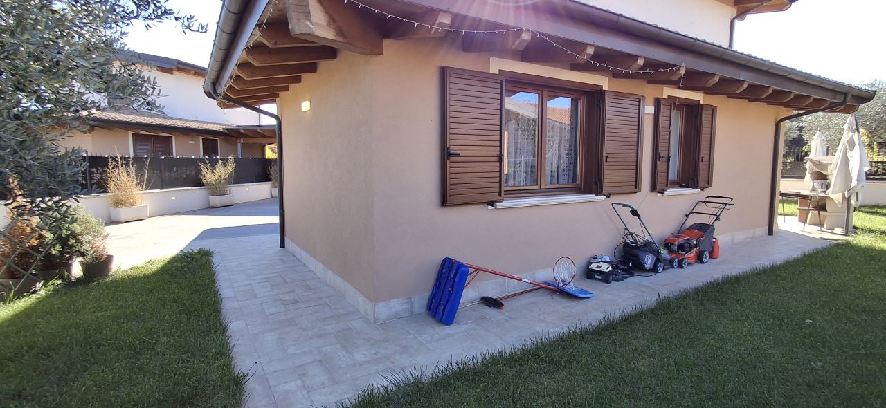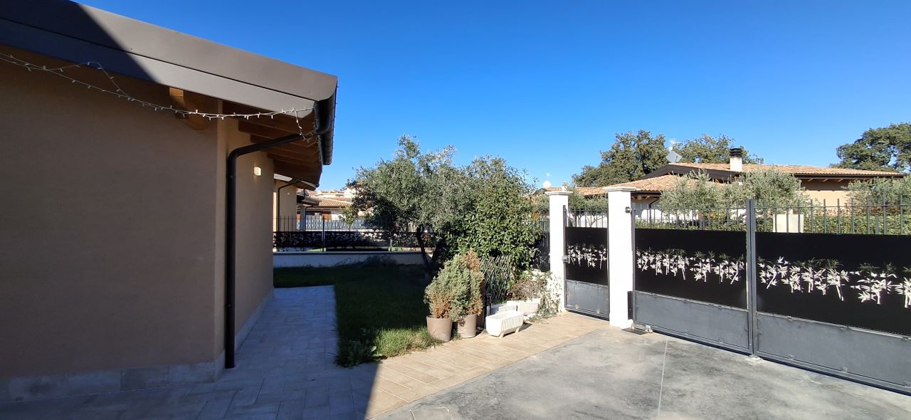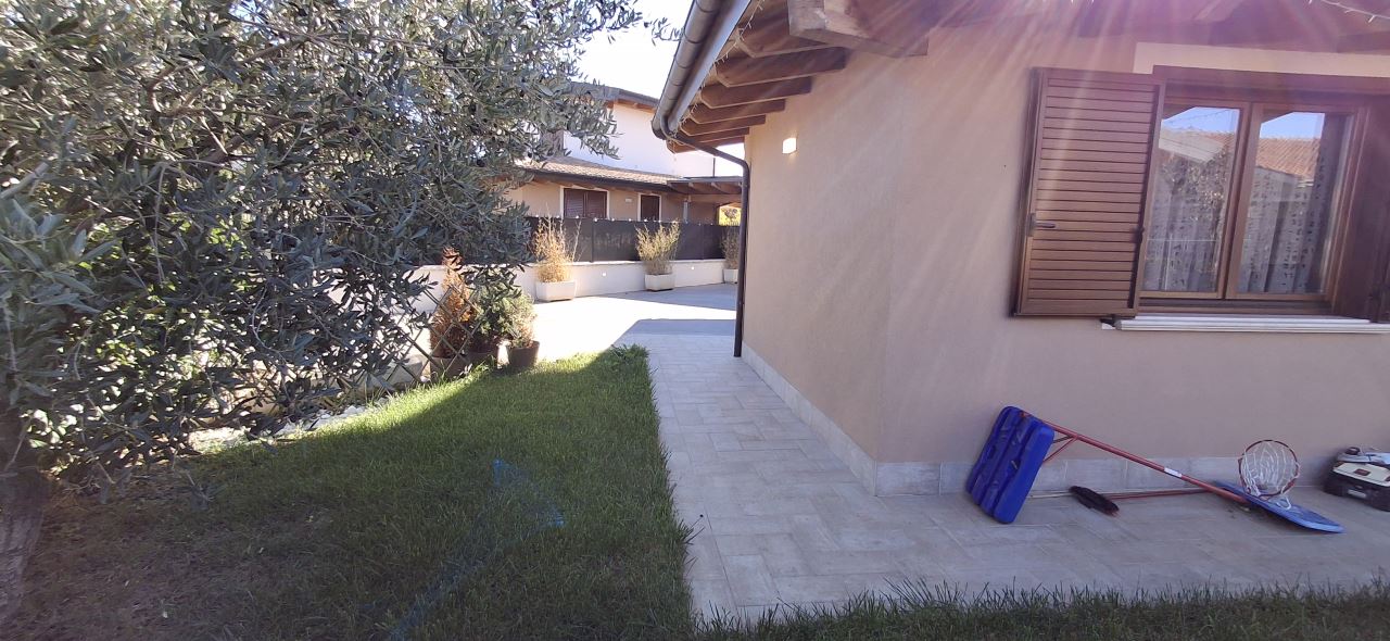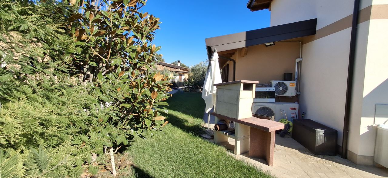 Esternamente giardino completamente recintato, area barbecue, pavimentazione pedonale dal cancello di accesso e perimetrale su tutto l'edificio, massetto industriale carrabile, accessorio di pertinenza adibito a rimessa / sala hobby completa di porta blindata, climatizzazione e copertura con impianto fotovoltaico da 3,00 Kw a servizio dell'abitazione.