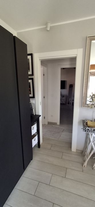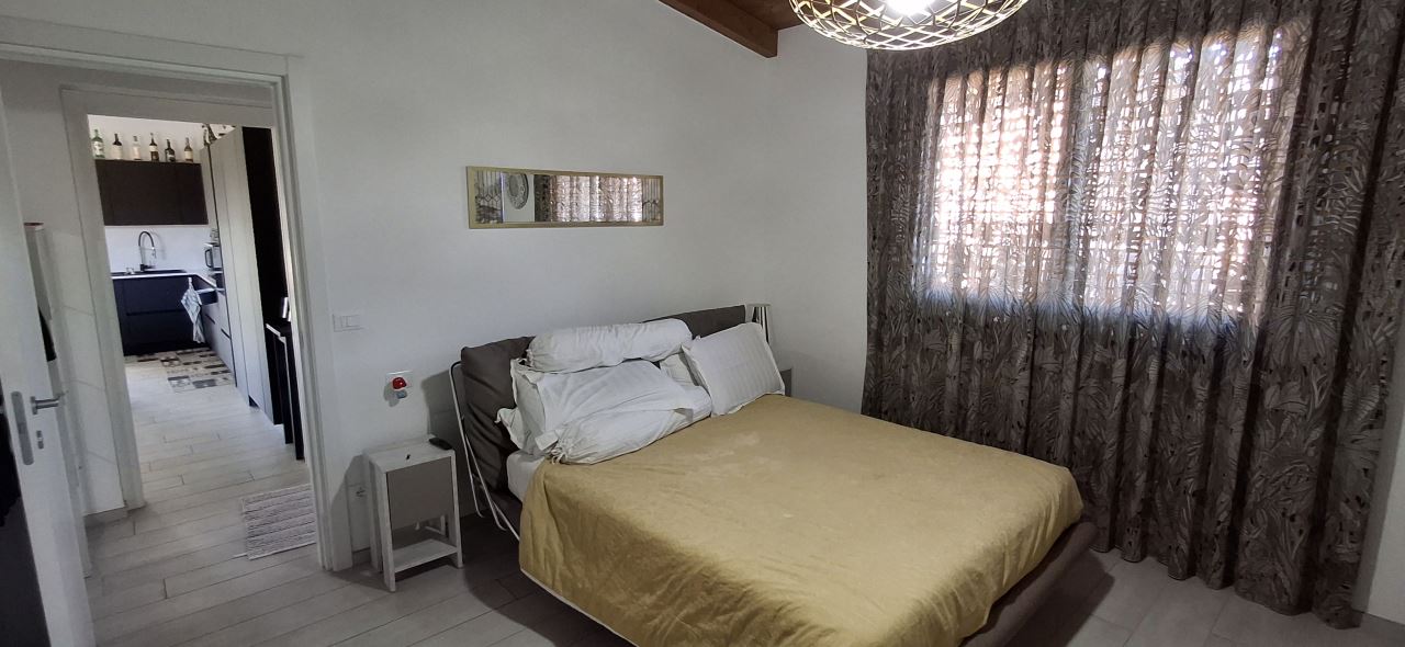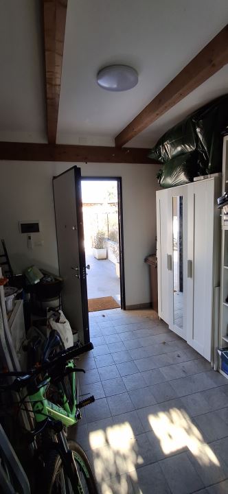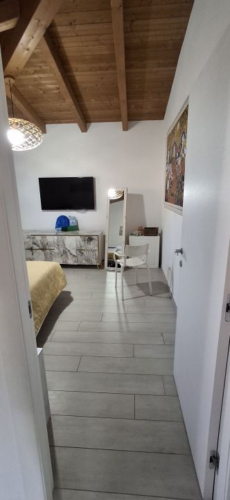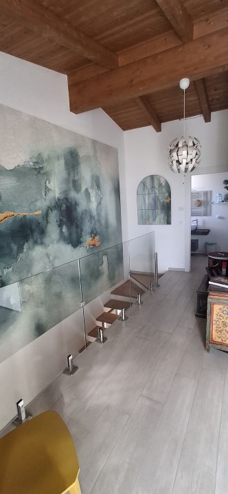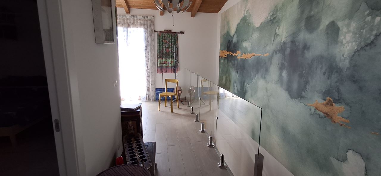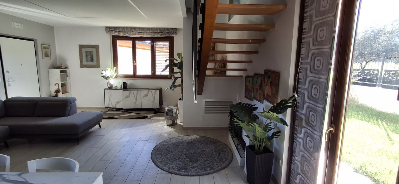 Accesso carrabile e pedonale che accompagnano al portico di ingresso per accedere all'abitazione; Piano Terra con ampio e luminoso open space e affaccio diretto al giardino esterno, angolo cottura e ripostiglio / locale tecnico, disimpegno di collegamento a servizio igienico e camera da letto; scala interna in legno a vista che conduce al livello superiore in cui sono collocati secondo bagno, seconda camera da letto oltre ad una zona studio, totalmente adatta anche per terza camera, perimetrata da parapetto in vetro con vista sulla scala e affaccio esterno su balcone con vista panoramica.
