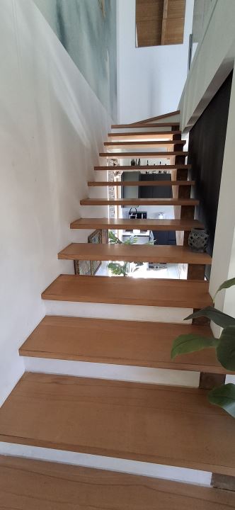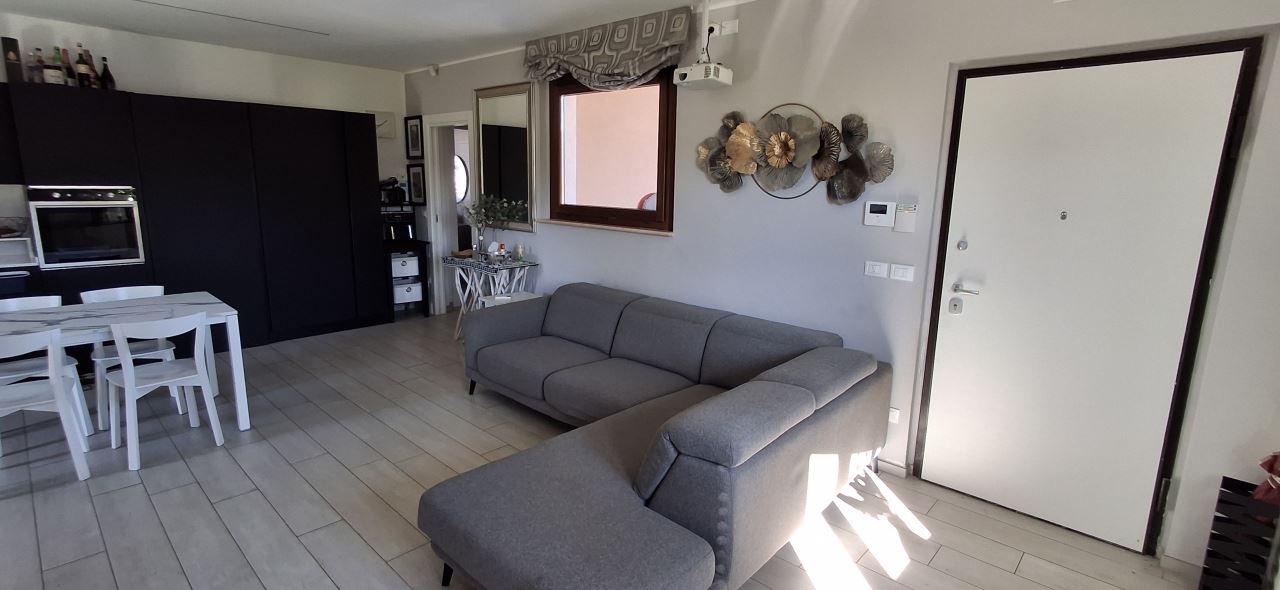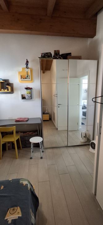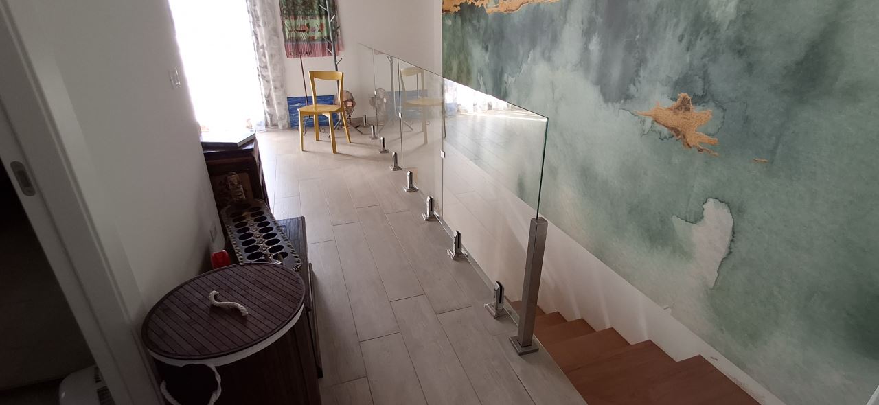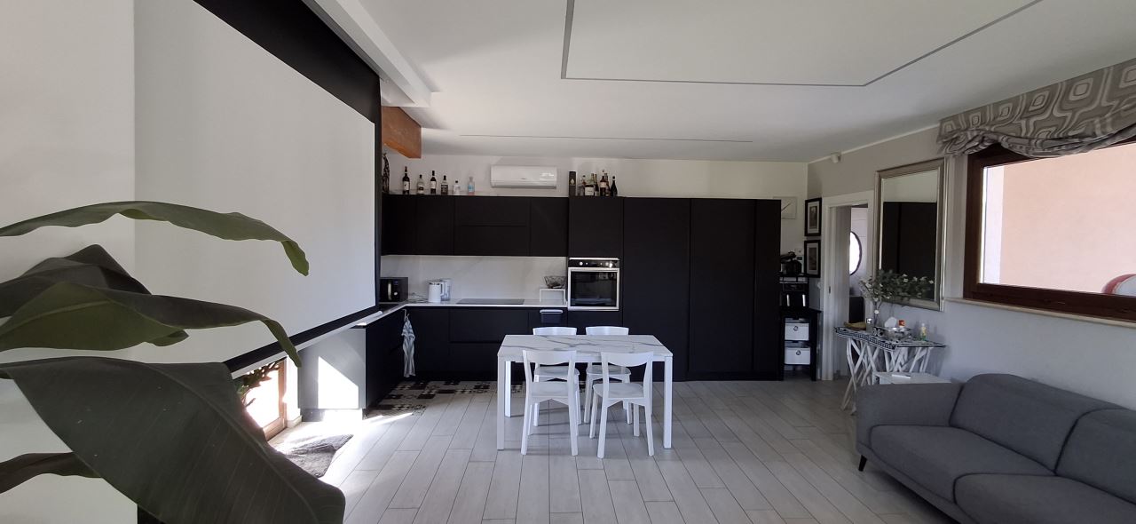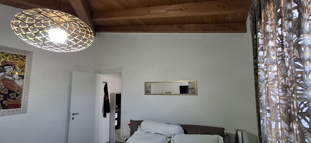 Accesso carrabile e pedonale che accompagnano al portico di ingresso per accedere all'abitazione; Piano Terra con ampio e luminoso open space e affaccio diretto al giardino esterno, angolo cottura e ripostiglio / locale tecnico, disimpegno di collegamento a servizio igienico e camera da letto; scala interna in legno a vista che conduce al livello superiore in cui sono collocati secondo bagno, seconda camera da letto oltre ad una zona studio, totalmente adatta anche per terza camera, perimetrata da parapetto in vetro con vista sulla scala e affaccio esterno su balcone con vista panoramica.